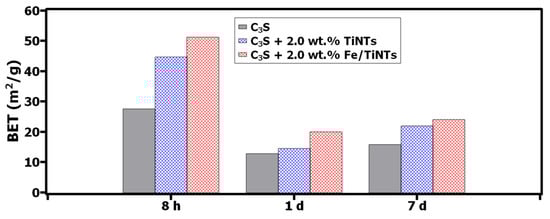 The calculation process was carried out for all samples and the respective BET specific surface area of hydration products has been calculated; the results are shown in Figure 10. Based on Figure 10, it can be observed that the BET specific surface area increased during the initial aging period of 8 h. This could potentially be attributed to the nucleation process and the formation of hydration products that resulted in gel formation. After 1 d, the BET specific surface area decreased significantly. The reason for this decrease could be due to the growth of hydration products, particularly the growth of portlandite. At a later age (7 d), the BET specific surface area increased once again, and this may be due to the growth and formation of more C-S-H phases. Both TiNTs and Fe/TiNTs influence the BET specific surface area of hydration products. The samples containing nanotubes show higher BET surface area compared to the pure ones, probably because they improve the nucleation and in turn, more hydration products are formed. Possibly, more C-S-H phases are formed, and the influence is seen as dominant in the presence of Fe/TiNTs.