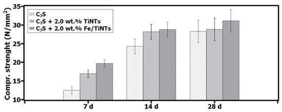 The compressive strength of the samples with different ages is presented in Figure 11. As is observed, the compressive strength of hydrated samples with Fe/TiNTs is higher, with respect to the hydrated samples, with TiNTs and pure C3S with different ages. We found a 36% increase in compressive strength for samples with Fe/TiNTs, while this was 26% in the case of samples with TiNTs for 7 d hydrated samples. Similarly, 16% and 14% increases on the compressive strength of Fe/TiNTs and TiNTs were found for 14 d hydrated samples, respectively. The compressive strength of 28 d hydrated samples also increased by 9% for Fe/TiNTs and 2% for TiNTs samples. The strength of hydrated C3S paste is mainly attributed to the formation of C-S-H phases []. The formation of hydration products increased gradually at the early ages, while this was increased at a relatively slower rate after 14 d.