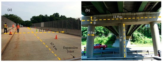 (a) Deck dimensions, and (b) substructure dimensions of the tested bridge.