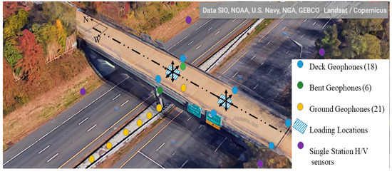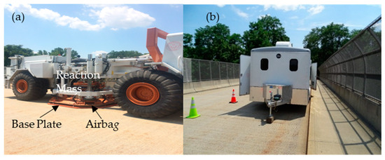 There are several research efforts that studied DSSI effects on bridges utilizing ambient vibrations or historic earthquake records [6,7,8,9]. However, the experimental validation of DSSI effects through field measurements still needs to be extensively studied. Large-amplitude shaking is promising since it can excite the entire structure–soil–foundation system (SFS) in a nondestructive manner. Nevertheless, there are some research efforts implementing various forced/controlled vibrations on serviceable structures for dynamic characterization of super- and substructures [10,11,12,13].