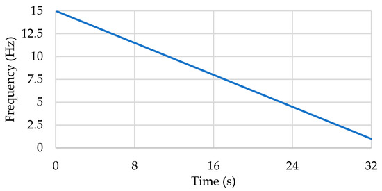A reverse linear chirp signal used to excite the bridge from 15 Hz to 1 Hz.