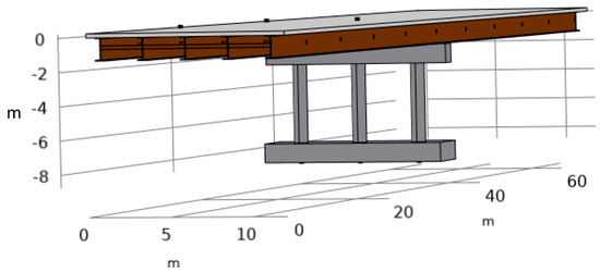 Figure 8 depicts an overview of the 3D model developed in COMSOL, which matches the geometry and dimensions of the actual bridge. Rayleigh damping was used to describe the damping characteristics of the bridge superstructure. Rayleigh damping is defined as viscous damping and is proportional to a linear combination of mass (M) and stiffness (K). It is expressed in terms of mass and stiffness as ξ = MαdM + Kβdk, where αdkM is the mass damping parameter, and βdk is the stiffness damping parameter. A value of βdk = 0.0065 was selected to represent the structural damping. αdM = 0 was set in the study since inertial effects are low in low-frequency ranges, and the behavior is more stiffness controlled. In addition, βdk was fixed in both time and frequency domains to maintain compatibility and modeling simplicity. It is a theoretical limitation that the damping loss factor cannot be set as a function of frequency in time domain studies. However, multiple Rayleigh damping ratios at multiple frequencies can lead to more accurate results in the frequency domain. Free tetrahedral elements with adaptive sizing were used to mesh the entire domain. Figure 9 illustrates the overall meshed model, in which concrete elements had coarser meshes, while steel elements (girders and bracing) were fine-meshed. This meshing resulted in 1,007,262 degrees of freedom (DoFs).