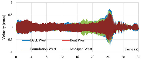The primary goal of shaking the Hobson Avenue Bridge was to perform structural identification (St-Id) to obtain resonant frequencies and modal damping. Experimental Modal Analysis (EMA) was performed from signals measured in the time domain and processed to produce various outputs. Figure 10 shows a typical time history obtained for bridge response from various signals, with the caption providing information about the loading direction and response measured. The response from one side of the bridge is shown as an example to avoid a cluttered representation. Power spectra are helpful to show at which frequencies the energy of a time-varying signal is concentrated. The variation of the response was examined under vertical and transverse highest loading scenarios when T-Rex was placed above the bent and at the mid-span to determine resonant frequencies of the soil–foundation–bridge system. The geophones above the bent were critical for identifying the transverse and rocking mode shapes since the bent of the bridge can capture the rocking motion. To obtain natural frequencies from the results, peak picking was used. Seven distinct natural frequencies of the bridge were identified. The modes were easily identified from the far-apart peaks, as presented in [36]. However, a complex motion of the bridge occurs in the 4–5 Hz range due to closely spaced modes. The first mode encountered occurs at 4.37 Hz. A peak in the vertical response occurs at 4.49 Hz, which is driven by the high energy vertical vibration of one of the bridge modes even though the shaking is horizontal, indicating the existence of a vertical mode of vibration. Two modes with dominant horizontal motion occur at 4.37 Hz and 4.61 Hz.