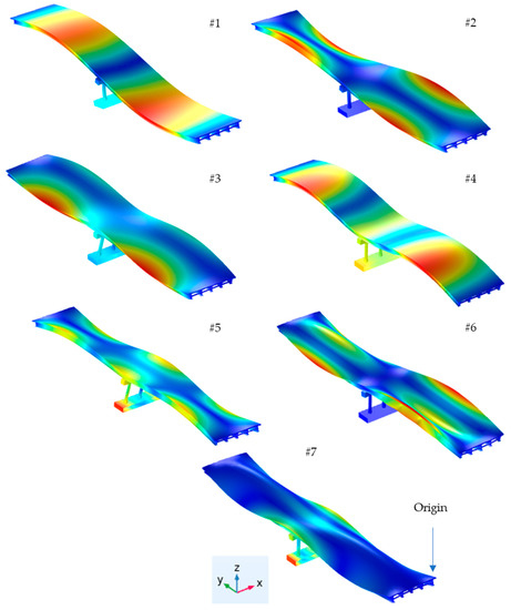 where Ji,r is the mass moment of inertia about the rth axis for the ith (e.g., J1,x = m[Y2 + Z2]), (X, Y, Z) is the center of mass of the SFS system, and n is the modifier between 3–5 to account for the overall off-center estimation in lieu of individual bridge components estimation. An average value of n = 4 was used, and the center of mass of the SFS system was found to be at (6.05, 33.7, −1.19) m from the origin indicated in Figure 11. Table 3 summarizes the estimated MPFs for each DOF. It can be observed that the presented modes capture most of the responses fairly, with the lowest MPF of ~0.65 for the significant motions. As expected, MPFy and MPFz-z, which correspond to translation along Y (longitudinal swaying) and rotation about Z (global torsion), are approximately 0. This confirms a proper assignment of boundary conditions. Furthermore, Mode#5 contributes as high as ~0.72 of MPFy-y (rocking), while Mode#3 contributes ~0.18 (both modes represent 0.9 of this motion). This indicates that rocking is primarily the vibration mode of Mode#5, while also exhibiting some swaying. On the other hand, Mode#3 has predominantly translation motion (swaying) compared to Mode#5. Nevertheless, swaying–rocking is coupled to some extent in both modes.
