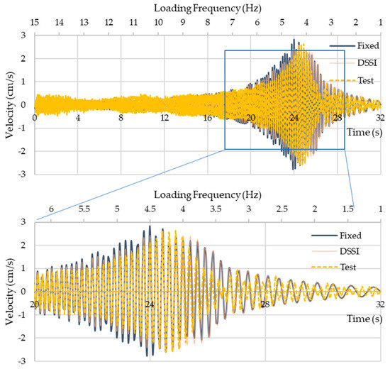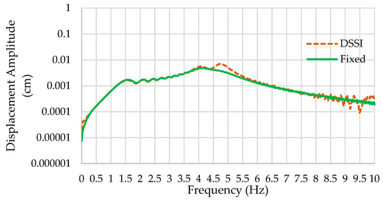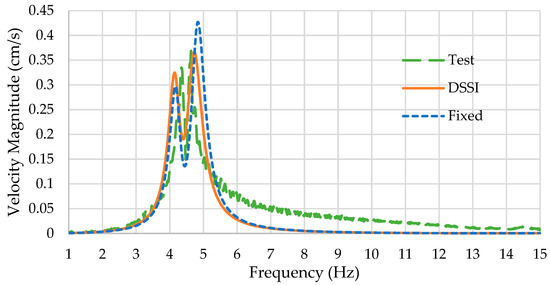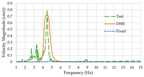where fini = 15 Hz, t is time, and δf is the frequency gradient (0.4375 Hz/s). Figure 12 shows response time histories caused by the lateral shaking for both the experimental and numerical results. The DSSI-incorporating model was more accurate than the fixed-base model when compared to the experimental results. Around resonance, the DSSI model showed a better match with the experimental results, supplemented by a lower mean absolute error (MAE). Table 4 shows a comparison of measured response and corresponding frequencies as obtained from the experimental results and both FE models. The maximum response from the experiment, 2.62 cm/s, occurred at a frequency of 4.16 Hz, as shown in Table 4. The maximum amplitude at the same frequency of the DSSI model was 2.53 cm/s, with a relative amplitude error of −3.5%. Meanwhile, the response at the same frequency from the fixed-base model was 2.41 cm/s with a relative error of −8.1%. Therefore, the fixed-base assumption led to a higher error in the response amplitude at resonance. The decrease in resonant frequencies due to DSSI, compared to a fixed base model, is in agreement with experimental results from other studies [39,40]. This is important since, despite the error in estimating the peak response being lower, the fixed-base assumption may lead to the omission of a vibration mode. This lateral mode is caused by soil flexibility, and its omission could lead to analysis and design errors [41,42,43]. The validated models were used to calculate displacements. Figure 13 shows a comparison of the deck’s response to horizontal excitation at a magnitude of 93.4 kN between the fixed-base and model the model including DSSI effects. It can be observed that the fixed-base model does not exhibit the multiple modes determined from the experimental study, hence skipping some modes, although they exist from the eigenfrequency analysis. Therefore, DSSI incorporation overall leads to a better match with amplitude and dynamic behavior when compared to experimental results. For the tested bridge, the incorporation of DSSI effects led to an increase in lateral displacement relative to the fixed-base model. For the mode exhibited by both models (~4.2 Hz), this increase is approximately 14%.