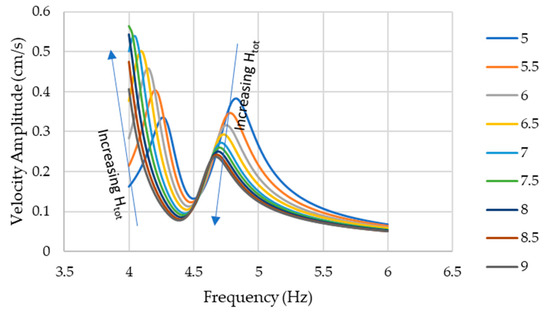 Figure 16 shows the effect of varying the structural height on the overall lateral response of the bridge to a 93.4 kN lateral load centered above the pier at the deck level. The increase in structural height led to the softening of the structure as expected and reduced the resonant frequency of both peaks. In addition, the 1st peak becomes stronger than the second when the height is increased beyond 5 m. This suggests that the coupling between swaying and rocking for this mode becomes stronger. Furthermore, while the first peak becomes stronger, the second peak becomes smaller with increasing height.