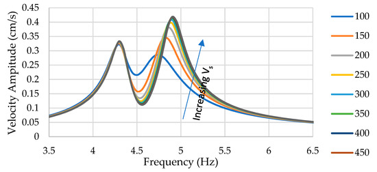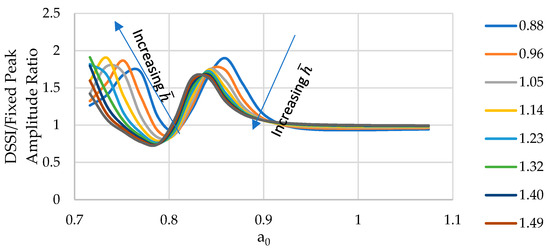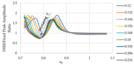 The rigidity ratio was estimated assuming f to be the frequency of the second peak obtained from the fixed-base model (4.8 Hz). This ratio was estimated by sweeping both Vs and htot. Figure 24 shows the effect of the rigidity ratio on the peak amplitude ratio of DSSI/fixed lateral deck response. Increasing led to a decrease in the maximum amplitude since the rigidity of the SFS is increasing. This is in agreement with the literature, since the system becomes closer to the fixed-base assumption [14]. Figure 25 shows the reduction of the second peak amplitude ratio and the frequency of the peak as a function of dimensionless frequency with increasing . This follows the expected behavior that increasing would eventually lead to a fixed-base condition.