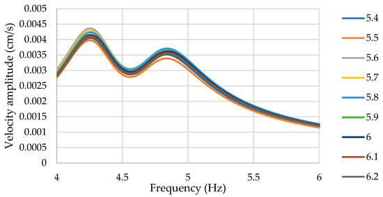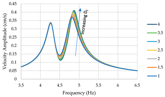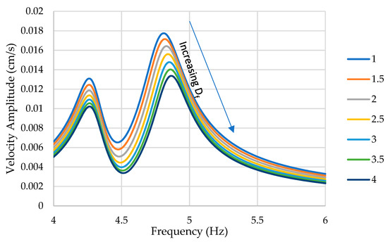Figure 19 shows the effect of varying the foundation depth on the lateral response of the footing. The effect of increasing the depth mainly led to high damping of the response by lowering the peak amplitudes. Through the figure, it is possible to infer a more intuitive and discernible difference in response to lateral shaking. In addition, the behavior of the footing is in agreement with the behaviors described by Wolf [14]. This is the case since damping is expected to decrease the peak response and slightly increase the frequency due to increased mechanical impedance (not to be confused with a lower damped frequency of SDOF systems). This result highlights the importance of having ground geophones either attached to the pier or the foundation itself if possible.