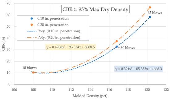 While the results of the CBR tests are provided in Table 4, the percent CBR versus molded density graphs are presented in Figure 2. The CBR tests for polymer-stabilized soils were conducted at three different polymer contents. The first polymer content was selected as the optimum moisture content obtained from the modified Proctor test, while the second polymer content was taken as the optimum moisture content obtained from the modified Proctor test plus 2% by the weight of dry soil. The third liquid polymer content was chosen as the optimum moisture content of water, which was 10.3%. The goal of selecting the third polymer content at an OMC of water was to obtain a common base for all the prepared samples, as is generally conducted in the literature.