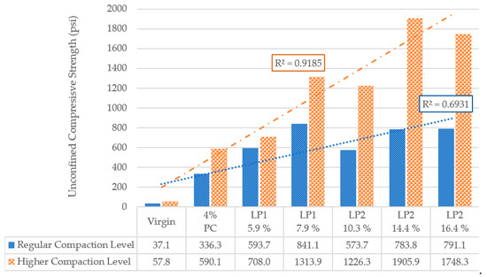 The results of the UCS test are provided in Figure 3. It was observed that any polymer-stabilized soil performed better than the virgin and PC-stabilized soils. Regardless of the stabilization and stabilization type, the UCS values of any soil sample enhanced as the compaction effort increased. The impact of compaction level was more dominant for LP2 polymer-stabilized soils. While the UCS values of virgin and PC-stabilized soils improved by approximately 56% and 75% with the higher compaction level, those of LP1 and LP2 increased on average by 38% and 126%, respectively. The maximum strength gain was obtained for the LP1-7.9% stabilization achieving 841.1 psi at a regular compaction level, and with LP2 at a 14.4% stabilization achieving 1905.9 psi (13.1 MPa) at a higher compaction level.