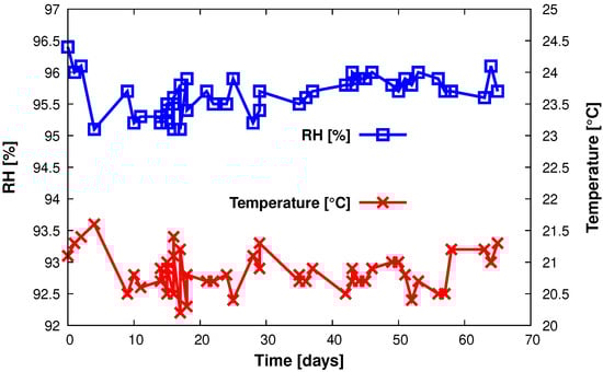 In the previous study, the samples were followed for 1000 days. The samples concerning the equal to 94% and stored over a solution of potassium chloride were kept to follow the long-term behavior (because in the case of higher , final swelling was observed, and the sample with = 91% was used to show that swelling could be initiated by placing the specimen into water []).