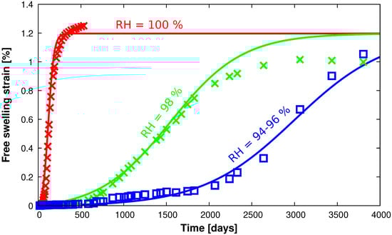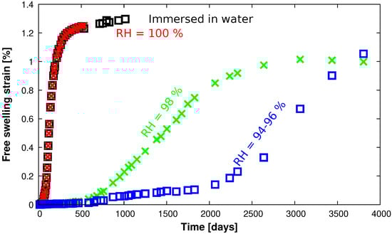 Recently, Martin et al. [] started a new program of tests at 75%, 88%, 92%, 96%, and 100% relative humidities with wetting–drying cycles, but the results are not yet available. Al Shamaa in [] has performed tests at 91%, 94%, 96%, and 98%. After more than 3 years, the samples that were stored below 96% did not show significant swelling. The samples stored at 94% were kept under this condition, and we present here the very-long-term behavior of these samples. Accidentally, the measurements were stopped for the samples at a relative humidity = 96%.