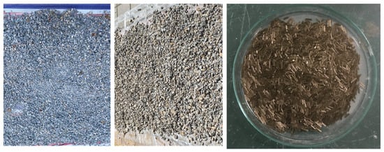 In-site photos of raw materials: NAs, natural coarse aggregates (left); RAs, recycled coarse aggregates (middle); BF, basalt fiber (right).