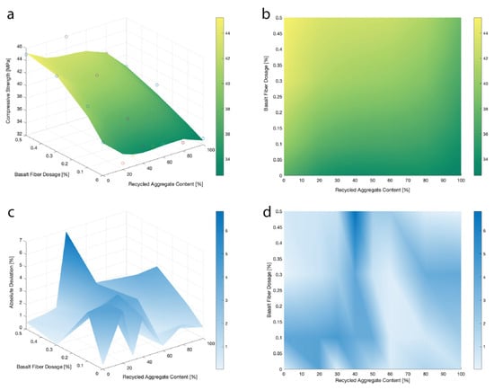 Compressive strength: (a) 3D trend surface of compressive strength, (b) contour map of compressive strength, (c) 3D distribution of absolute deviation, and (d) contour map of absolute deviation.