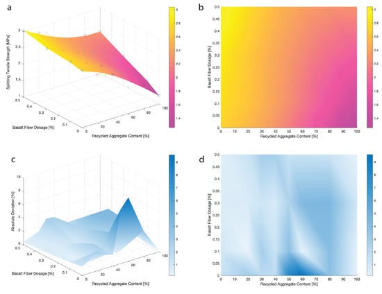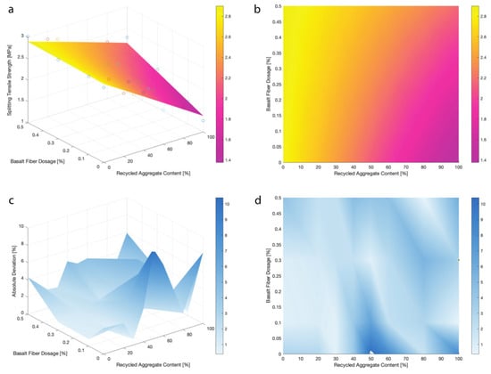 Splitting tensile strength with quadratic function: (a) 3D trend surface of splitting tensile strength, (b) contour map of splitting tensile strength, (c) 3D distribution of absolute deviation, and (d) contour map of absolute deviation.
