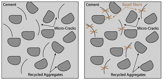 Schematic diagram of enhancement mechanism: without basalt fiber (left) and with basalt fiber (right).