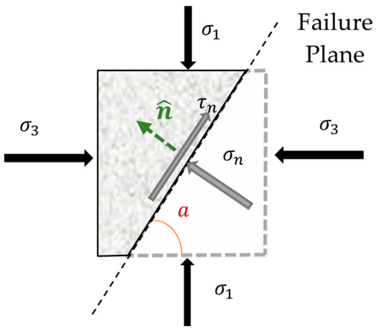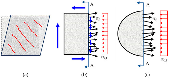 The stresses on the shear failure surface were obtained by the normal and shear load components, divided by the shear plane’s area (R∙t) according to Equation (7). In Equation (7), t is equal to the depth of the specimen and R = (H2 + L2)1/2 is the length of the sliding plane (Figure 8, Table 1):