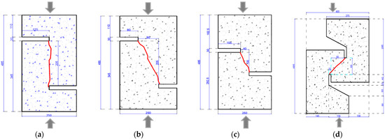 Dimensions and layout of the push-off specimens: (a) pure shear stress (PSS); (b) shear compression A (SCA); (c) shear compression B (SCB); (d) shear tension (ST).