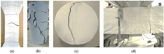 Typical failure patterns observed in the SHCC material characterization tests: (a) direct tension; (b) uniaxial compression; (c) cylinder splitting; (d) four-point bending.