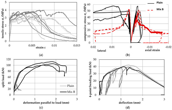 Figure 4 plots the sample results obtained from the SHCC and plain mix stress–strain and load-deformation diagrams from the various material tests. For the uniaxial tension, after the first crack, multiple cracking appeared on the specimen within the critical section (Figure 4a), with the tensile strength gradually increasing with a mild hardening slope, exhibiting characteristics of an elastic–plastic response curve, up to a tensile strain of 0.01. The tensile cracking strength ranged between 2.5 to 3.5 MPa, whereas the ultimate tensile strength varied between 3.0 and 4.0 MPa. The flexural strength behaviour is plotted in Figure 4d. The same trend of higher flexural values is observed, while the tensile strength of the Plain mix that failed in a brittle manner was only one-quarter of that of the mixes that included fibres.