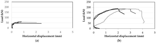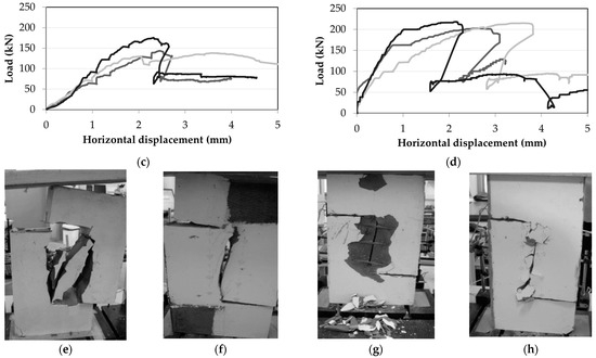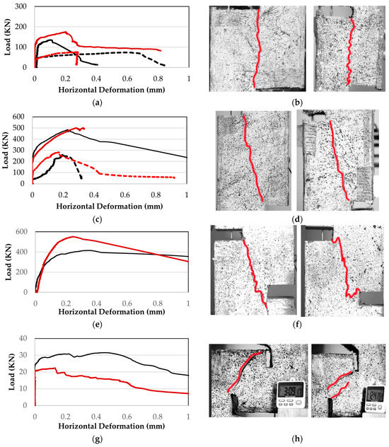 Load-horizontal deformation diagrams of push-off tests with/without fibres and reinforcement bars: (a,e) PSP; (b,f) PSB; (c,g) PSP-R; (d,h) PSB-R.