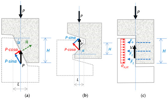 The shear strength of SHCC in relation to the magnitude of normal stresses σn acting on the shear plane was developed by determining the τn-σn interaction curve of the SHCC corresponding to a Mohr–Coulomb failure model. Here, the subscript on the normal and shear stress refers to the normal to the plane of sliding, , see Figure 7a. The components of the load normal to the shear plane, , (shown in red in Figure 7a,b) and parallel to the shear plane, , (shown in blue in Figure 7a,b) were derived, with α being the inclination/slope angle of the shear plane measured with reference to the horizontal plane, α = tan−1(H/L), where H is the vertical distance and L the horizontal distance between notches.