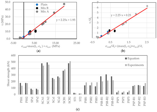 The shear and normal stress values plotted in Figure 9a are normalized with respect to the , which is considered a multiple of the tensile strength for cement-based composites as explained in the introduction; therefore, the shear strength of a cross section with fibres, axial load, and rebars acting on or crossing the shear plane is determined from Equation (10). The calculated value from Equation (10) for each individual specimen is plotted against the experimental peak value in Figure 9c. The graph indicates that all specimens having either normal stresses acting on the shear plane and internal fibre confinement, or cases where confinement is provided by stirrups without fibres, are all organized by a single expression for the limiting shear strength of the failure plane.