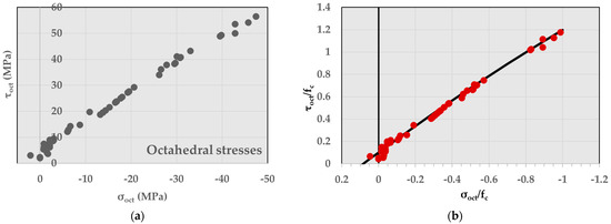 Τo maintain the symmetry of the failure criterion with respect to the principal axes, the octahedral stresses τoct and σoct, which are invariant combinations of I1 and J2, were used (see Equation (2)), while the influence of J3 or θ was neglected. As a starting point, the relationship between the octahedral stresses which was calibrated for normal concrete (Equation (1)) was considered and correlated with the available experimental database for SHCC developed for the needs of the present work. All the material characterization tests conducted by the authors [27,31,39] were included in the calibration along with the push-off results of this study, to increase the range of the testbed supporting the derivation of the failure criterion. In total, a collection of results from more than 60 experiments were used, which included: uniaxial tension, uniaxial compression, splitting, push-off, and confined cylinders in compression with the use of carbon and glass FRP jackets in various layers. The relations between the octahedral stresses are approximated by a quadratic parabola, as per Equation (1) [28,29] (normal stresses σc were positive when tensile and the value of fc always positive). The parameters a, b, and c are established by curve-fitting of the available experimental test data. The equations that were used to derive the octahedral stresses of the experimental set were given in Section 2.1. The complete set of octahedral stresses of all the experiments are plotted in Figure 10a, while in Figure 10b the experimental values are normalized by the compressive strength of the material, and they are fitted with the parabola shown with the black line. The equation of the parabola has the following form: