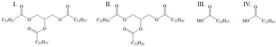 - Szewczyk, P. Study of the Phase Behavior of Triacylglycerols Using Molecular Dynamics Simulation. Master’s Thesis, University of Alberta, Edmonton, AB, Canada, 2010. [Google Scholar] [CrossRef]