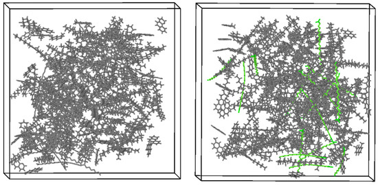 Molecular dynamics simulations were carried out using the Large-scale Atomic/Molecular Massively Parallel Simulator (LAMMPS) [43]. Interactions within asphalt and WCO molecules were modeled using the OPLS-AA force field and a specific force field based on Paulina et al.’s work [44,45,46,47,48], respectively. For the non-bonded interaction calculations, a cutoff distance was set at 15 Å, and the Particle–Particle–Particle–Mesh (PPPM) method was employed for long-range electrostatic interactions. Initially, all molecules were positioned randomly in a cubic simulation box with a 20 nm edge using PACKMOL software [49], with periodic boundary conditions in all three dimensions (X, Y, and Z). The simulations began with a 1 ns canonical ensemble (NVT) at 404 K to energy-minimize the system. This was followed by a 20 ns isothermal–isobaric ensemble (NPT) at the same temperature and 1 atm pressure to achieve equilibrium. Post-equilibration, we collected the data for subsequent analysis. Figure 3 illustrates the initial configurations of the aged and WCO-modified asphalt simulations.