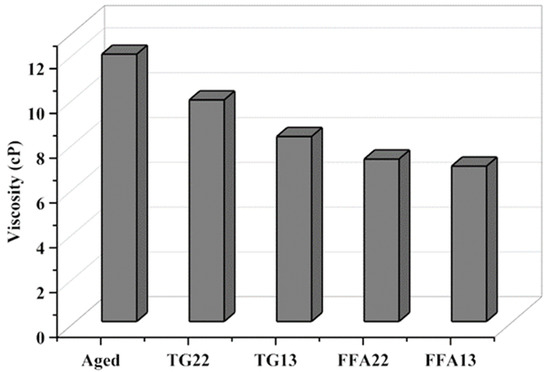 The shear viscosities of the aged and WCO-modified asphalts at 1 atm and 404 K are shown in Figure 4. Before the modification, the aged asphalt had the highest viscosity, around 12 cP, which agrees well with the reference results under similar P/T conditions [13,55]. Introducing the WCOs into the aged asphalt clearly decreased its shear viscosity, consistent with the previous experimental observations [17]. It can be seen that the FFAs generally decreased the viscosity of the aged asphalt more than the TGs. In addition, considering the FFAs and TGs separately, the viscosity reduction in the aged asphalt with TG13 is obviously stronger than that with TG22, while the strength of the viscosity reduction from FFA13 and FFA22 in aged asphalt is almost the same. This observation indicates that the chain-length effect on the viscosity modification of aged asphalt exists in TGs but not considerably in FFAs.