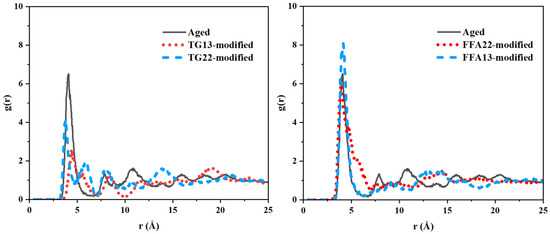 Left: RDFs of asphaltene–asphaltene pairs from aged, TG13-modified, and TG22-modified asphalts. Right: RDFs of asphaltene–asphaltene pairs from aged, FFA13-modified, and FFA22-modified asphalts. The x-axis denotes the inter-particle distance. The units for this measurement are given in angstroms (Å), where one angstrom is equivalent to 0.1 nanometer (nm).