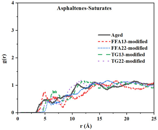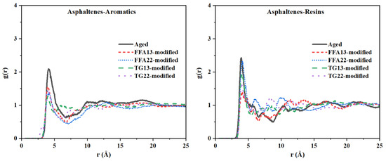 The RDF results of the asphaltene–asphaltene pair of aged and WCO-modified asphalts are shown in Figure 5. The RDF of an asphaltene–asphaltene pair in aged asphalt has a first peak around 4 Å, indicating the preferential interactions among asphaltene molecules in the aged asphalt. The observation of such preferential interactions existing between asphaltenes in asphalt was reported in other publications before [58,59], which gave us confidence regarding the reliability of our RDF analysis. On the left of Figure 5, the peaks of the RDFs of the asphaltene–asphaltene pairs of TG13-modified and TG22-modified asphalts decreased, indicating that the TG molecules weakened the preferential interactions between the asphaltene molecules and could prevent their self-aggregation. In addition, the RDF of the asphaltene–asphaltene pair of the TG13-modified asphalt had a lower peak than that of the TG22-modified asphalt, suggesting that TG13 molecules could weaken the preferential interactions between asphaltenes more efficiently than TG22 molecules, which was probably the reason why TG13 had a stronger viscosity reduction effect on aged asphalt than TG22, as shown in Figure 4. On the right of Figure 5, the peaks of the RDFs of asphaltene–asphaltene pairs of FFA22-modified and FFA13-modified asphalts were similar to that of aged asphalt, indicating the FFA molecules did not obviously weaken the preferential interactions between asphaltenes and prevent their self-aggregation. Comparing the molecular structures of TG and a FFA, the glycerol backbone of the TG molecule has heteroatoms like oxygens that may enhance the interaction between an asphaltene molecule and itself, which is the possible reason for why the TG could weaken the interaction between asphaltenes but the FFA could not.