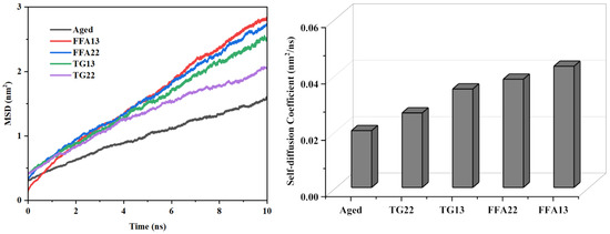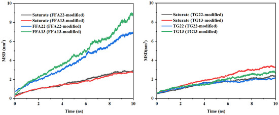 Saturates represent the fraction of asphalt with the smallest MW and the largest mobility [61,62]. On the left of Figure 9, the MSDs of FFA and saturate molecules were calculated, respectively, in FFA-modified asphalts. Similarly, on the right of Figure 9, the MSDs of TG and saturate molecules were determined in TG-modified asphalts. It is clear to see that the slopes of the MSDs of FFA molecules are obviously larger than those of saturates, indicating that the mobility of FFA molecules in FFA-modified asphalts is the largest, even over saturates. On the other hand, the slopes of the MSDs of TG molecules are very similar to those of saturates, suggesting that the mobility of TG molecules is at the same level of mobility as saturates in TG-modified asphalts. Hence, it can be concluded that as the FFAs were introduced into the aged asphalt, the proportion of the highest mobility fraction increased and distributed in the aged asphalt, which increased the mobility and decreased the viscosity of the aged asphalt. However, in TG-modified asphalts, in addition to separating the asphaltene aggregations, the addition of TGs with relatively high mobility is another reason why the viscosity and mobility of TG-modified asphalts could be affected.