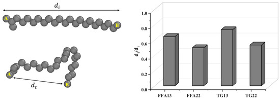 To study the entanglement of WCO molecules in modified asphalts, the method from Hsu and Violi’s paper was employed [63]. A relative distance was determined from the ratio of dt over di, where di represents the original straight distances between the first and the last carbons of FA chains, and dt represents the real distances between the first and the last carbons of FA chains when distributed in modified asphalt, as shown on the left of Figure 10. As the relative distance approaches 1, it indicates that the degree of entanglement is small. As the relative distance approaches 0, it indicates that the degree of entanglement is large. The relative distance results of the WCOs are calculated on the right of Figure 10. Comparing TG13 with TG22 and FFA13 with FFA22, respectively, the smaller relative distances come from the longer chain lengths, which indicates that the longer chain length in the WCO would have a high probability to entangle with other asphalt molecules in modified asphalts. In Figure 11, TG13 and TG22 molecules in modified asphalts are visualized separately to support our relative distance result. It is clear that the FA chains in TG13 behave more straightly than the FA chains in TG22, which reduces their possibility of entangling with other asphalt molecules.