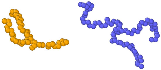 Orange: visualization of a TG13 molecule moving in TG13-modified asphalt. Blue: visualization of a TG22 molecule moving in TG22-modified asphalt. The asphalt molecules around the TG molecules are hidden for clarity.