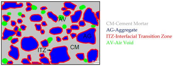 Here, HPC is indicated as a high-performance concrete consisting of ordinary Portland cement, water, superplasticizer, and aggregates and as having a water-cement ratio of 0.35. The proposed MDCT specimens are subsequently cast, based on the specifications of ASTM standards. The three materials are considered individually for experimental investigations at the mesoscale, namely, high-performance concrete with basalt (HPC-B), high-performance concrete with gravel (HPC-G), and high-strength coarse mortar (CM). The basis is a high-strength concrete composition, from which a high-strength concrete equivalent mortar composition is developed in accordance with the concept of excess paste theory. The purpose of this study is to experimentally analyse the fatigue crack growth in HPC while focusing on the mesoscale. The mesoscale is delineated as the scale in which the concrete is considered to be comprised of aggregates above a size threshold of 2 mm to be suitably specified as follows: pores (air voids) above the same size threshold, cement mortar, and interfacial transition zone (ITZ) mortar (i.e., the region of the material at the interface between aggregates and cement mortar). The schematic representation of the mesostructural composition of HPC is illustrated in the Figure 1.