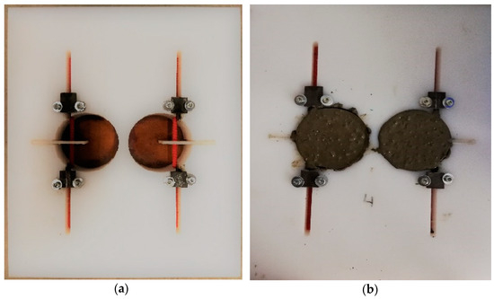 In order to obtain the proposed MDCT specimens, the polyethylene boards PE 1000 are perforated with an internal diameter of 100 mm using a Computer Numerical Control (CNC) drilling machine. Subsequently, the PE boards are further drilled to accommodate pulling glass fibre reinforced polymer (GFRP), which are threaded pulling bars with diameters of 8 mm and notches of 2 mm thickness. GFRP threaded bars are incorporated to evade artefacts in the CT image stacks and to reduce the bending moment at the loading point. The ratio of the notch length to the specimen width (a/W) is 0.3 for all specimens. Thereafter, the disk-shaped concrete specimens are prepared in the laboratory by pouring the concrete mixes into the prefabricated moulds as shown in the Figure 2a and are further compacted on a vibratory table as displayed in Figure 2b. In this way, premature failures such as the breakage of concrete and stress concentration around the pulling load holes are avoided by applying the pulling force by means of threaded bars, which are fabricated in conjunction with the concrete. All the samples are demoulded after 24 h, cured in water for 28 days and stored in climate chamber at constant ambient conditions (20 °C, 65% RH).