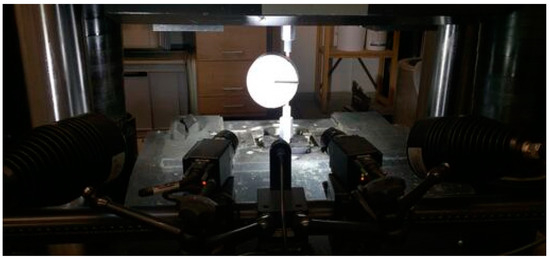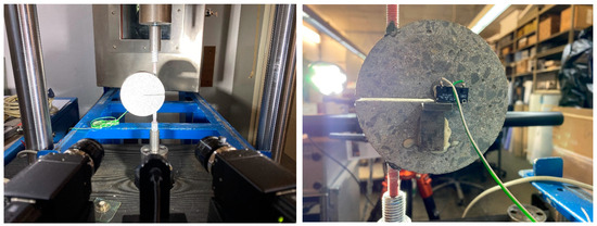 The static compact tensile tests are carried out under the displacement control of the electro-mechanical testing machine at a rate of 0.001 mm/min. The static tests are performed for a minimum of six specimens with different material compositions such as HPC-B, HPC-G, CM, and basalt. The digital image correlation (DIC) tool ARAMIS from GOM is implemented to analyse the crack opening displacements (CODs) and deformations of the specimens under the external load of the static tensile tests. The free ends of the GFRP threaded bars are subsequently clamped into the electro-mechanical testing machine at a distance of approximately 80 mm apart from the axis of the initial notch. Two cameras are directly affiliated and used in conjunction with the ARAMIS software to record the displacements and strains at a working distance of 320 mm during the subsequent loading steps, and the test setup is shown in Figure 4.