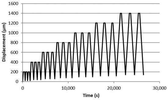 The low-cycle fatigue tests are performed in a quasi-static monotonic manner under displacement control of the electromechanical testing machine. The test specimens are loaded under displacement control up to the complete failure point, and the testing is performed in such a way that the crack propagation is localised in the ligament area of MDCT specimen. The methodology involves the assignment of a displacement-controlled load at a rate of 0.1 mm/min in 12 stages and a retention time of 300 s for each stage as shown in Figure 5, wherein the specimen failed during the 21st load cycle.