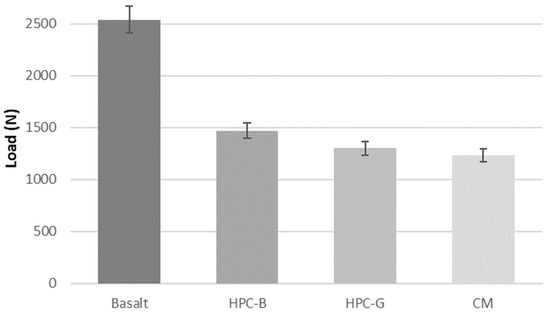 It is revealed from the static tensile tests performed on different material compositions that the basalt specimen is the dominant material composition with an average ultimate load of about 2540 N. The material composition of HPC-B, HPC-G, and CM demonstrated an average ultimate load of about 1470 N, 1300 N, and 1230 N, respectively. For each of these material compositions, six specimens are evaluated to determine their average load-carrying capacities, with the results presented in Figure 9.