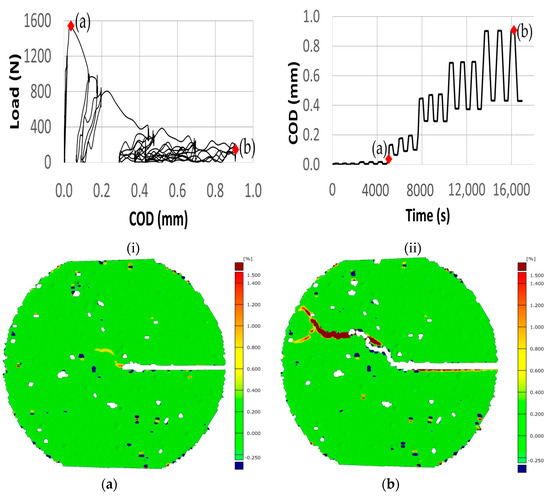 Sequential crack progression under low-cycle fatigue testing. (a) Initial crack appearance at the centre of the specimen, capturing the onset of fracture highlighting the onset of fracture in relation to the Load-COD curve (i) and Time-COD curve (ii); (b) Subsequent crack propagation leading to the complete splitting of the sample, illustrating the full extent of specimen failure, corresponding to the Load-COD curve (i) and Time-COD curve (ii).