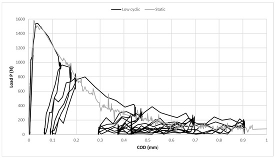 Comparison of Load-COD curve for the experimentally determined static and low-cycle fatigue tests.