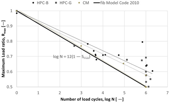 Figure 13 demonstrates the experimental results in comparison with the R-N curve from fib Model Code 2010 in terms of the number of load cycles and the maximum load ratio. The dotted lines represent the trendlines derived from the high-cycle fatigue tests conducted on the HPC-B, HPC-G, and CM compositions. It is evident from Figure 13 that an increase in the load level results in the decreasing fatigue resistance of the concrete. In other words, the experimental results corroborate the fact that the lower the maximum tensile load applied, the higher the number of cycles N that the material can withstand. The experiments carried out on different concrete compositions reveal that HPC-B is characterized by higher load levels in comparison with HPC-G and CM.