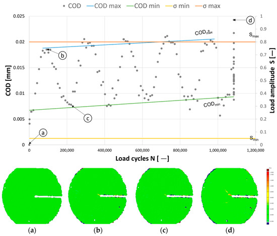 (a–d) Evolution of the crack path recorded with the DIC tool during the high-cyclic tensile tests.