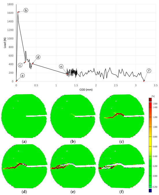 The evolution of the crack (a–f) with respect to the static tensile load is demonstrated in Figure 15, wherein Figure 15a represents the initial non-deformed phase of the specimen. From the load-COD curve, it can be noticed that for the initial part, the curve is almost linear and the strain at the notch tip increases with increasing load. Following a linear phase of the P-COD curve, the deviation from the linear curve is observed and the local tensile strain increases to about 1%, which suggests the initiation of crack formation at the tip of the notch. With the further increase in tensile load, the curve demonstrates an increase in tensile strain until the peak load of 1616 N with a COD of 40 μm is reached, so that the strain at which the load reaches its maximum value is considered to be the initial crack load, and the corresponding recording is illustrated in Figure 15b. After the maximum peak load, a brittle failure of the specimen is observed, with the load reducing dramatically and the crack opening displacement being 0.228 mm, as depicted in Figure 15c. This is due to the sudden drop in stress as a result of progressive deformation. In addition, the abrupt increase in tensile load from 451 N to 700 N (Figure 15c) is attributed to the presence of a stronger basalt aggregate intervening in the crack growth path, indicating a phenomenon of crack branching as well as a progressive increase in resistance imposed by the aggregate interfering with the crack path. The gradual decrease in load from 411 N with a COD of 0.406 mm to 166 N with a COD of 1.273 is observed and is ascribable to crack bridging as depicted in Figure 15e. Due to the highly brittle properties of cement paste and the interlocking of the aggregates, the behaviour after Figure 15e exhibits unstable, abrupt upward and downward motions, as depicted in Figure 15f. In addition, it is apparent from Figure 15 that the P-COD curves from the ARAMIS measurements effectively characterize the different stages (a–f) of crack propagation and that the crack-opening mode corresponds to pure mode I.