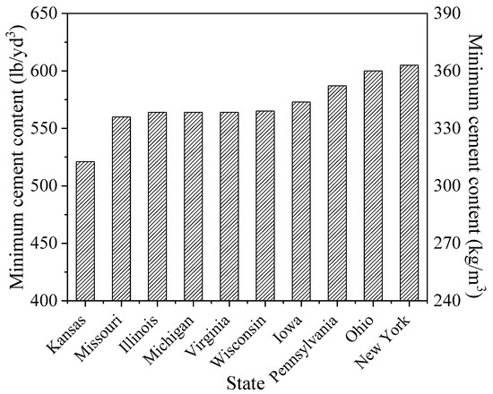 Some SHAs recommend conducting trial mixes to determine the minimum CMC (CalTrans Standard Specifications, 2019) [11]. However, most SHAs specify limits on the minimum CMC needed in a concrete mixture. For example, in the case of concrete pavement mixtures, the minimum specified CMC varies between 550 lb/yd3 (326 kg/m3) and 611 lb/yd3 (356 kg/m3) (Rudy and Olek 2012) [12]. This is illustrated in Figure 1. Past studies by Popovics (1990) and Wassermann et al. (2009) indicate that these values are conservative and far exceed the CMC needed for the required strength and performance [9,13]. Additionally, LeBow (2004) reported that a concrete mixture with a CMC of 517 lb/yd3 (307 kg/m3) can meet both the fresh and hardened characteristics required of a 611 lb/yd3 (362 kg/m3) cementitious content mixture [3]. A more recent study by Trejo et al. (2022) reported that comparable hardened properties (compressive and flexural strength) can be achieved even after reducing the CMC by approximately 15% if the aggregate is characterized prior to proportioning [5]. Both Lebow (2004) and Trejo et al. (2022) reported that, apart from satisfying the specified requirements, the mixtures with lower CMCs also exhibited lower drying shrinkage [3,5]. It is clear that a methodology is needed to minimize CMCs while also achieving the required concrete characteristics.