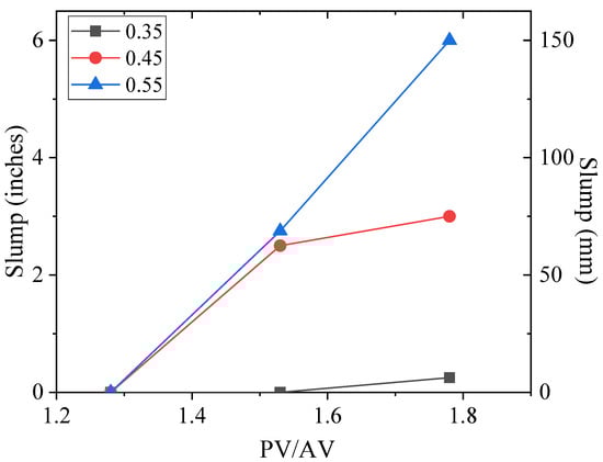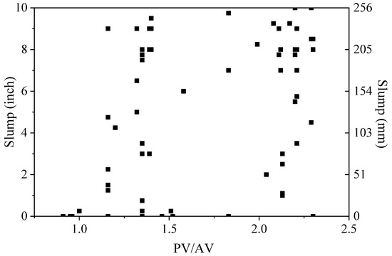 - This research numerically quantified the impact of PV/AV on the characteristics of concrete by developing MLR models. PV/AV has a significant impact on the slump and a moderate influence on compressive strength. For the materials used in this study, a 0.05 increase in PV/AV resulted in a slump increase of 0.3 inch (0.7 cm). The same increment in PV/AV will also result in an increase of 34 psi (0.25 MPa) in the case of the 28-day compressive strength. The PV/AV does not significantly influence the bulk resistivity.