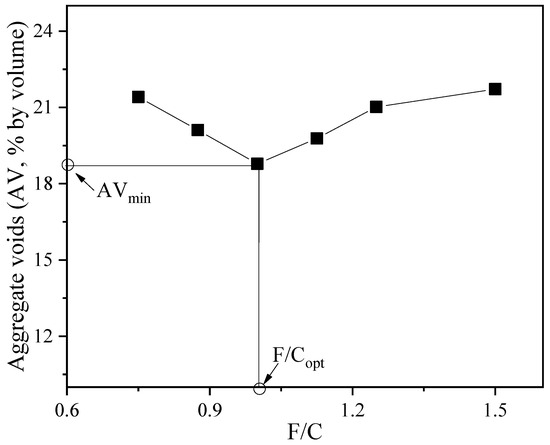 The amount of voids in the aggregate system (fine and coarse) can change significantly depending on the aggregate types and the fine-to-coarse aggregate ratio. Therefore, it is necessary to evaluate the void content of the fine and coarse aggregates at different aggregate weight ratios to determine the ratio at which the void content is minimized. For this, the AASHTO T19 test is performed with different fine-to-coarse aggregate weight ratios (F/C). The AV content of the combined aggregate system for each F/C value, as shown on the abscissa of Figure 3, can be determined using the following (AASHTO T19) [24]: