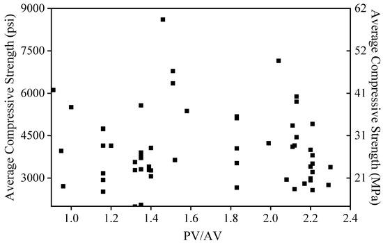 Scatter plot of 28-day compressive strength as function of PV/AV.